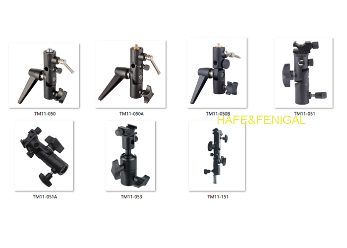 이 시리즈는 맞춤형 디자인의 5가지 모델을 포함합니다. TM11-050/TM11-050A는 7/8mm 리셉터클(우산 폴 표준)과 각도 조절을 위한 회전 메커니즘을 특징으로 합니다. TM11-051A는 조명 기구용 범용 슈 마운트를 통합합니다. TM11-051/TM11-151은 다양한 기구 크기를 수용하기 위해 조절 가능한 슈 마운트를 추가합니다. 무게는 0.18kg(소형 모델)에서 0.37kg(더 튼튼한 회전 어댑터)까지 다양하며, 휴대성과 하중 지지 능력의 균형을 맞춥니다.